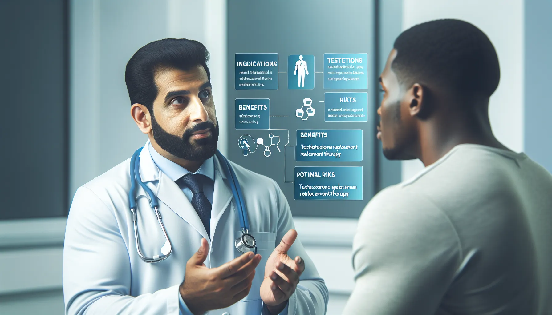 Discuss risks like erythrocytosis, acne, edema, and sleep apnea. Document benefits like improved libido and energy with verified hypogonadism. Sources: Endocrine Society 2018, FDA labeling.